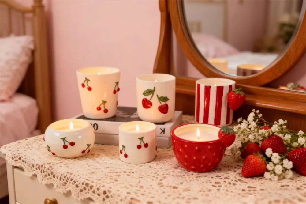 BYF „Super Adorable Ceramic Candle Jar“ serijoje yra aukščiausios klasės rankų darbo keraminiai žvakių stiklainiai su „super mielu“ dizainu. Dizainuose yra klasikinių saldžių elementų, tokių kaip raudonos vyšnios, trimačiai lankeliai ir braškės, su lygia glazūra ir įvairiomis formomis. Pagaminta iš saugių ir aplinkai nekenksmingų medžiagų, pasižymi puikiu atsparumu karščiui ir puikiai tinka standartinėms dagtėms bei įvairiems vaško pagrindams, todėl tai yra tiek aukštos kokybės žvakių talpykla, tiek meniška puošmena, puošianti jūsų namų interjerą.